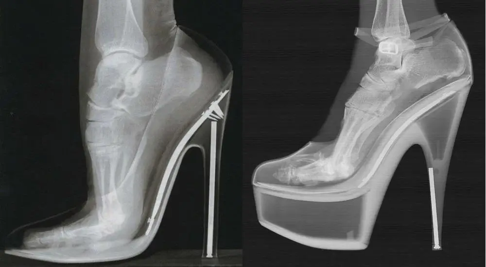 Consideration should be given to the feet’s position when wearing heels that are higher than 10 cm. Platforms are most recommended. Please see the link leading to the x-ray below. Both shoes have approx. 14cm heels. The left shoe has no platform, the right shoe has a 4cm high platform. The instep of the woman wearing the heels without platforms is almost vertical, very unnatural, while the instep of the woman wearing platforms is much closer to a natural angle (which is about 21 degrees), even though the heels themselves are the same height. Also, the arch of the foot wearing non-platform heels is more unnaturally curved, but the arch of the foot wearing platform heels is not so unnaturally curved. This means that the woman’s entire weight is on the balls of her feet when wearing non-platform heels, but the weight of the woman wearing platform heels is distributed more evenly between the balls and heels of their feet; Even though she’s wearing 14 cm heels, it feels more like she’s wearing 10 cm heels! For all day wear, it is best to wear heels 10cm or less, and save the stilettos without platforms 10cm and highter for limited wear and special occasions.
